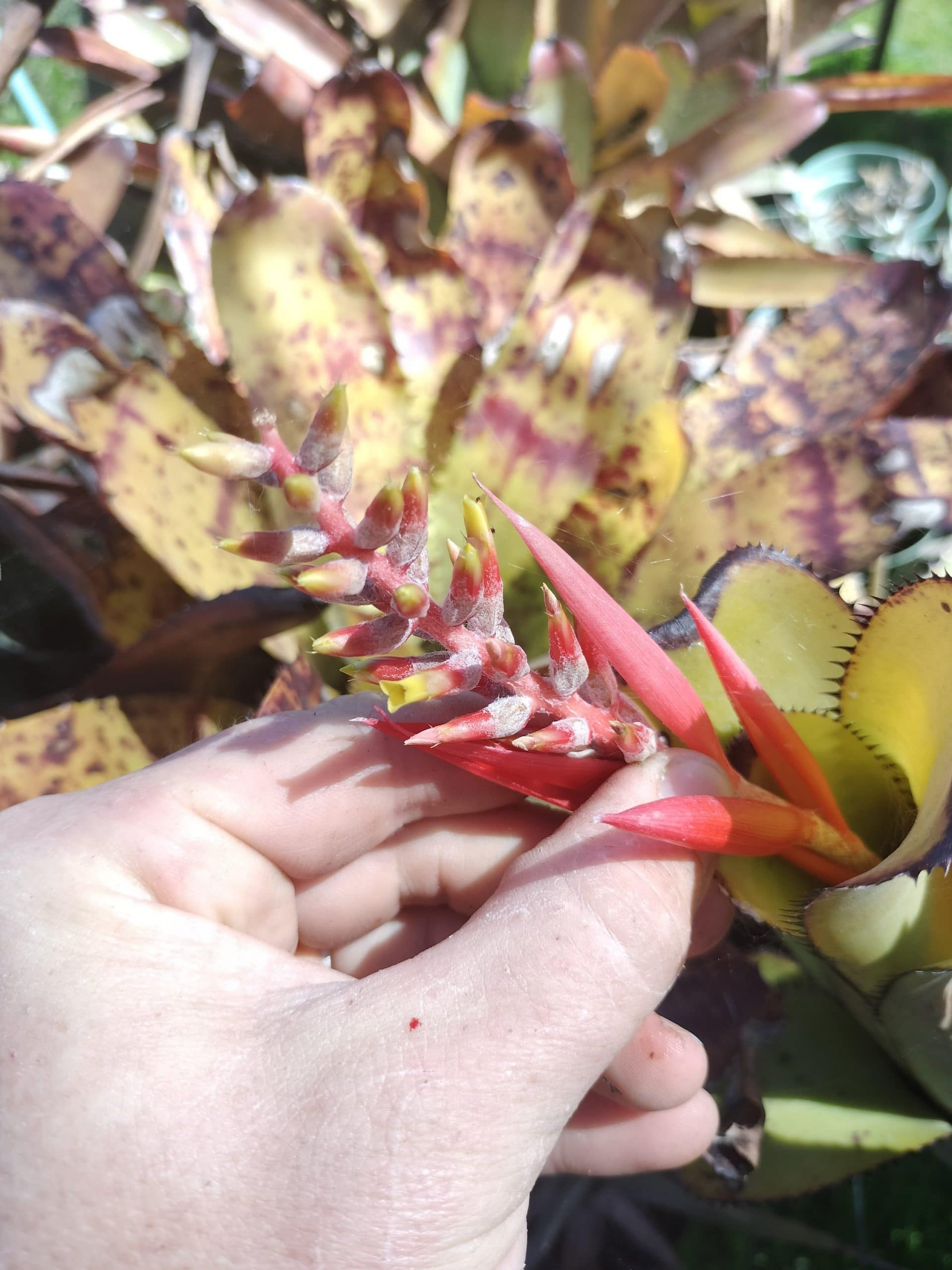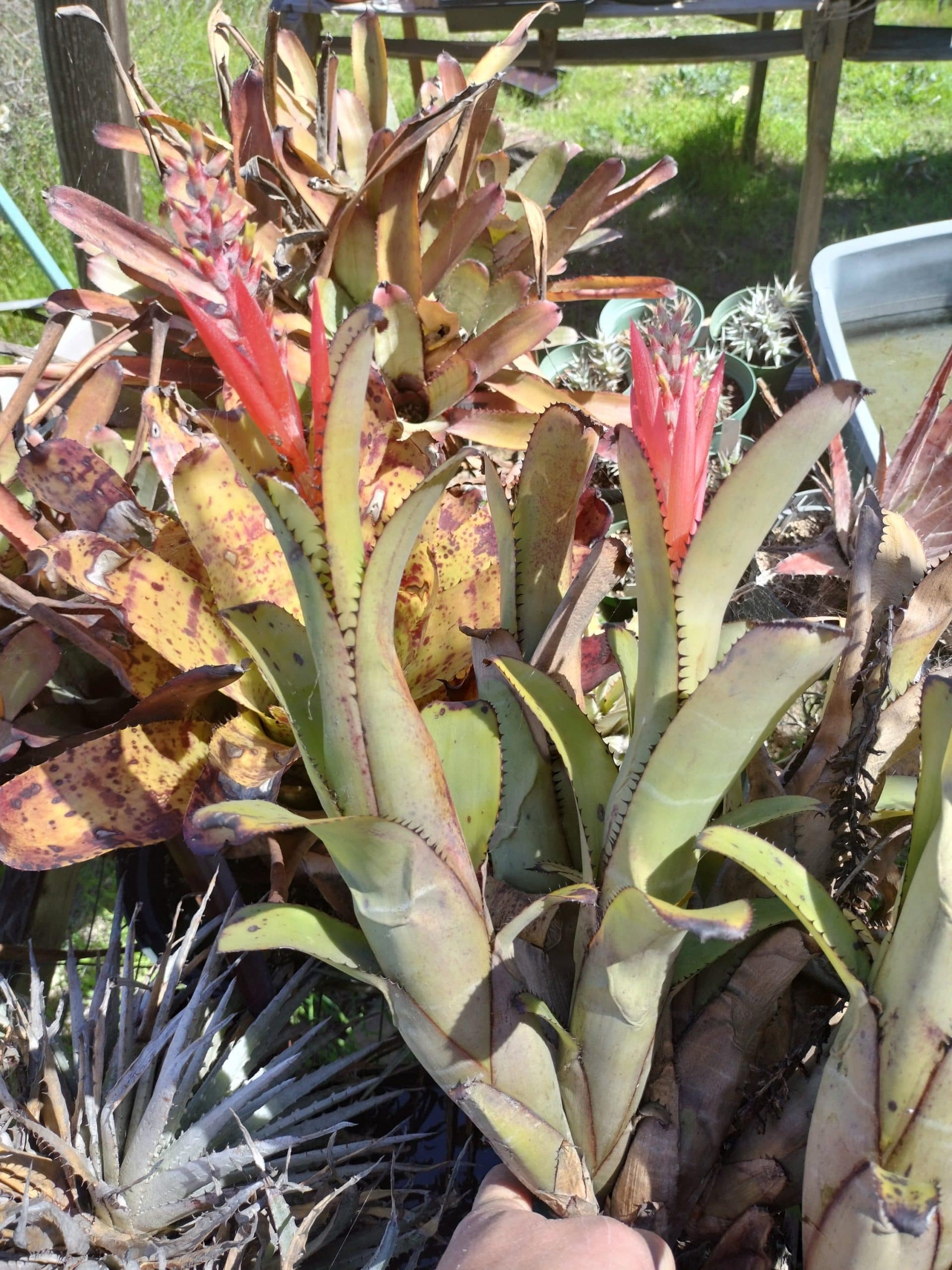 A nice, strong-growing Aechmea nudicaulis var aureorosea. This variety is named for the color of the flowers, gold-tipped red petals…unusual for the species.