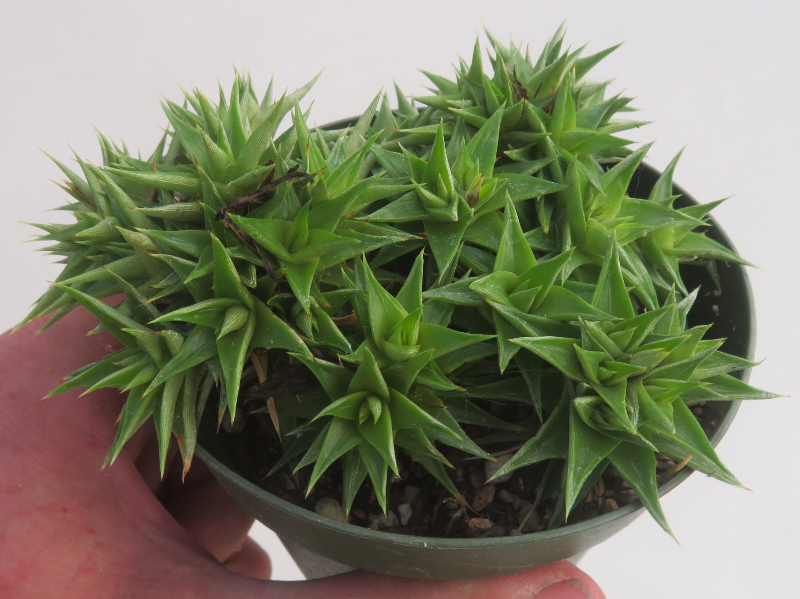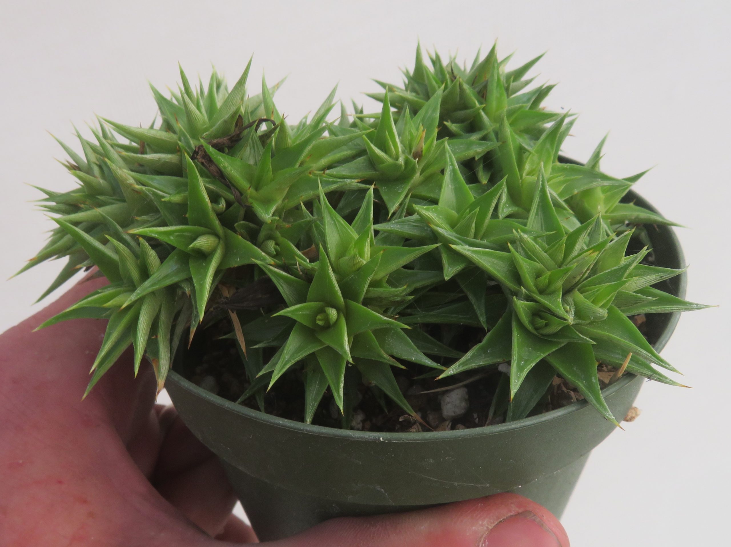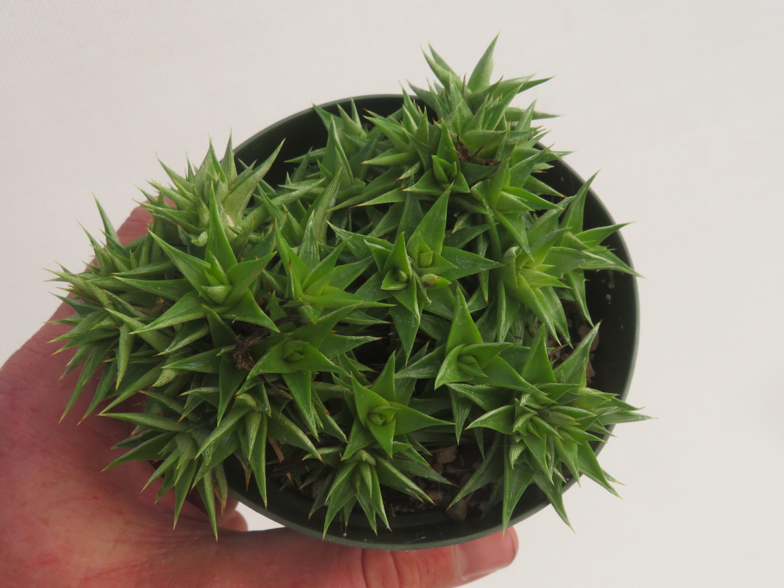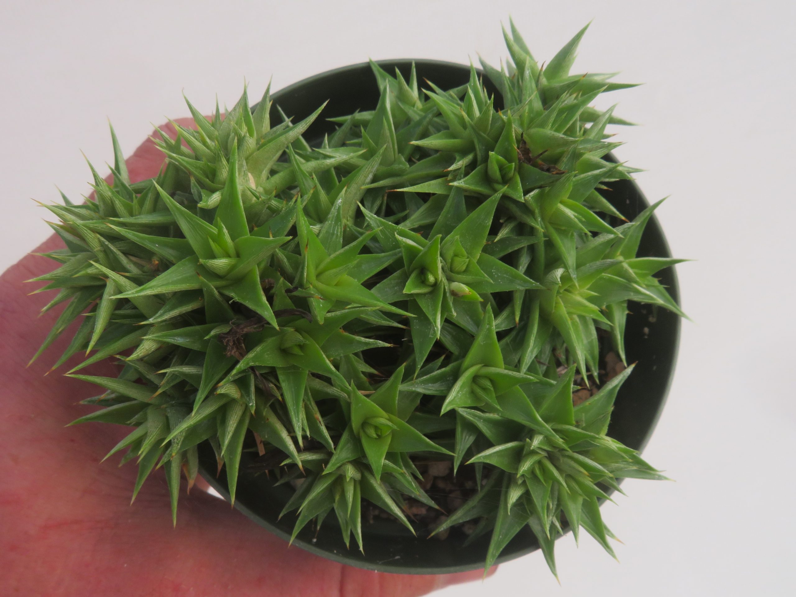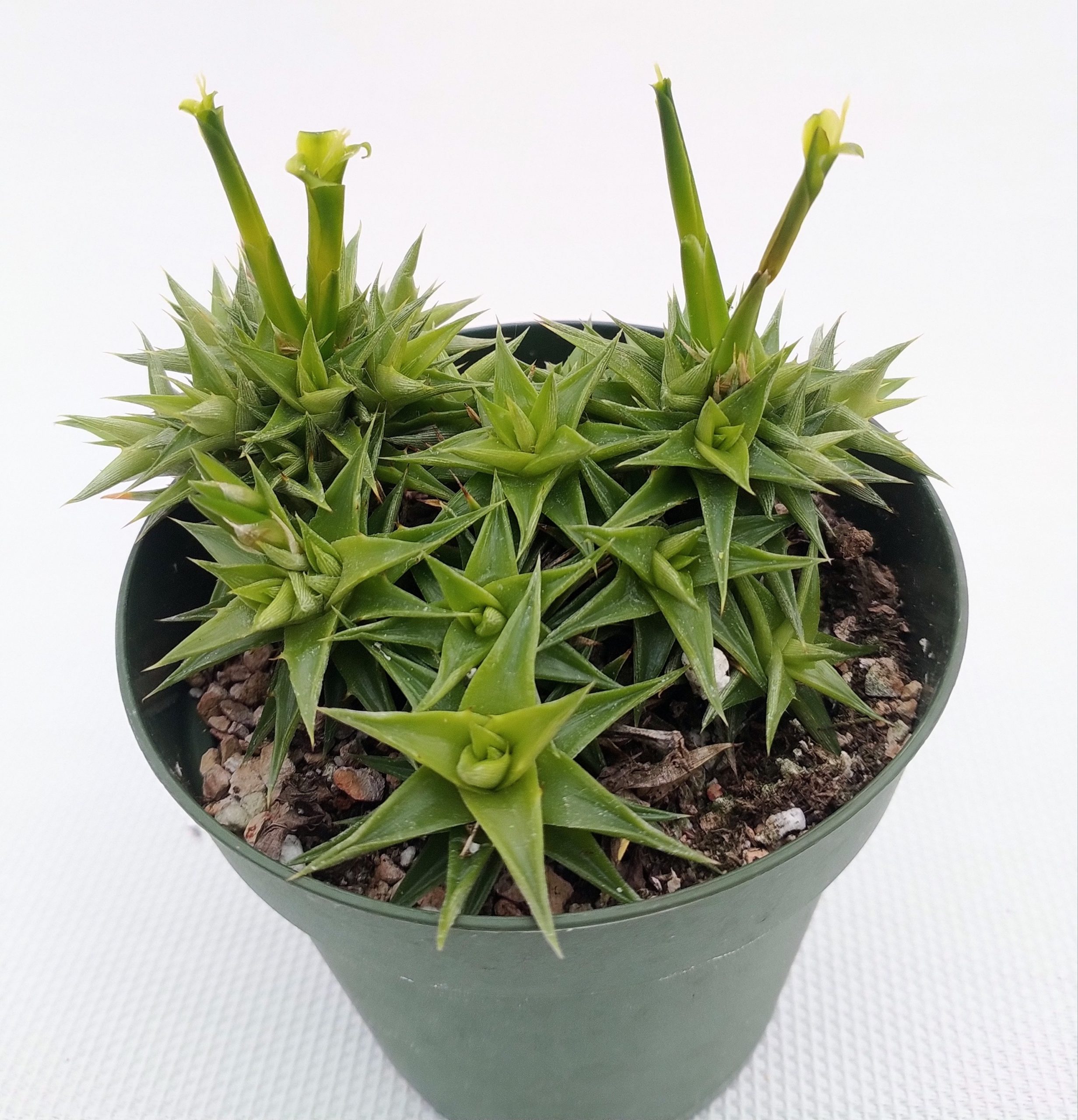 Deuterocohnia ‘Little Marj’ is a form of Deuterocohnia brevifolia collected by Australians Chris Larson and Marj McNamara from northwestern Argentina. The plant grows in a bright green rosette with few marginal spines on the leaves. Despite minimal marginal spines on the leaves, the tip of each leaf is strong and is sufficient to discourage handling it without caution.