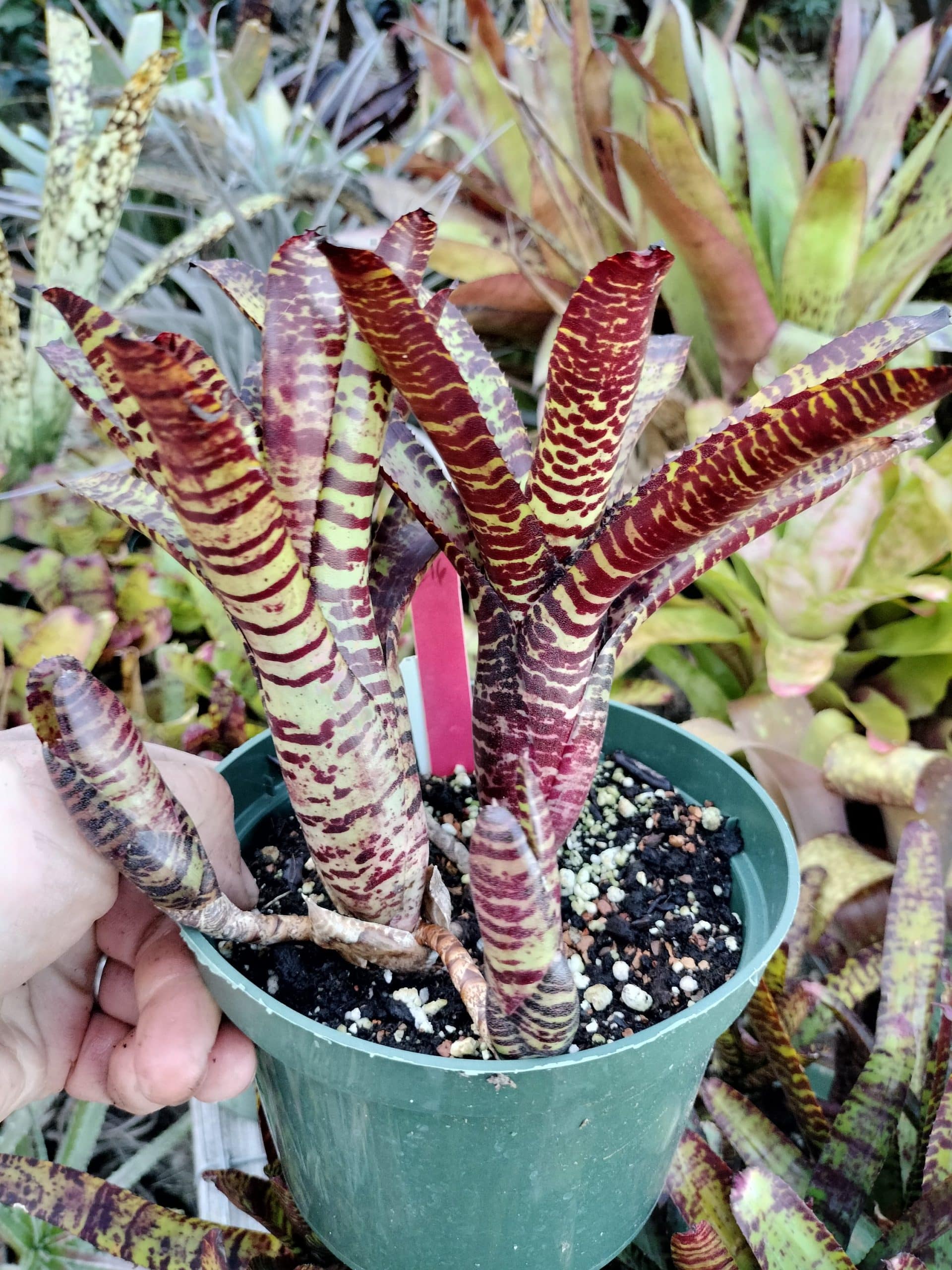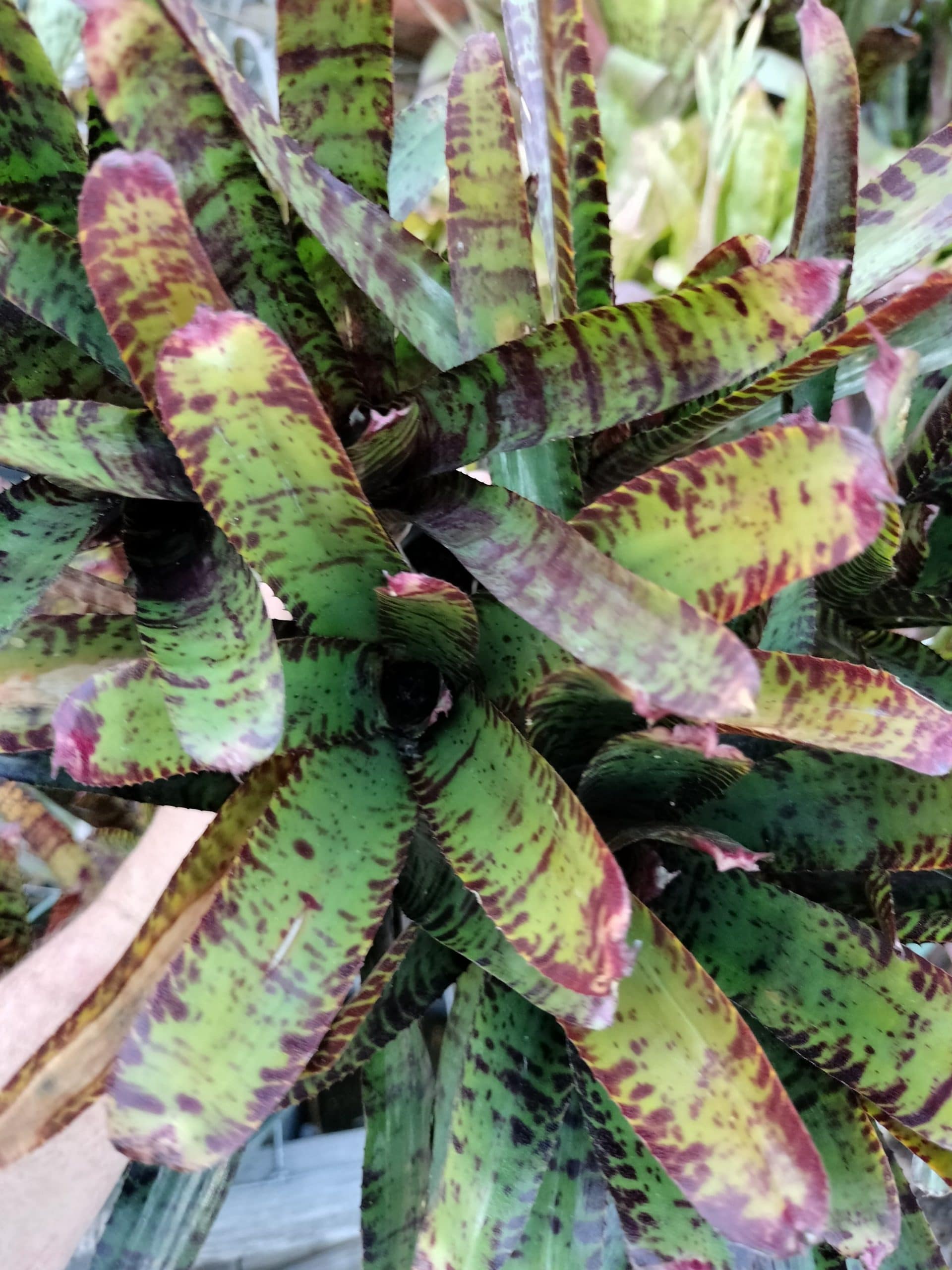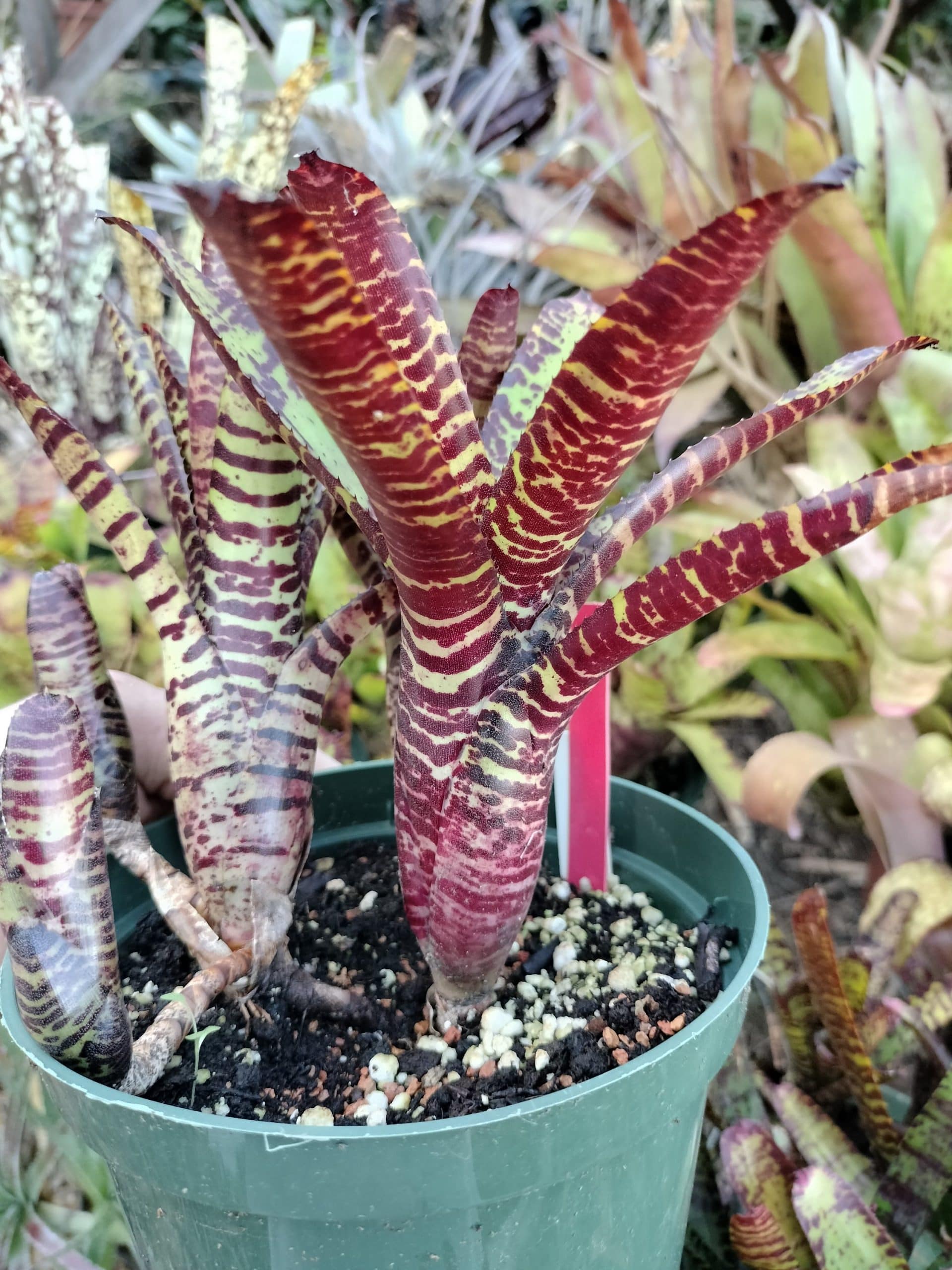 Neoregelia Licorice Twist is a strongly patterned mini.