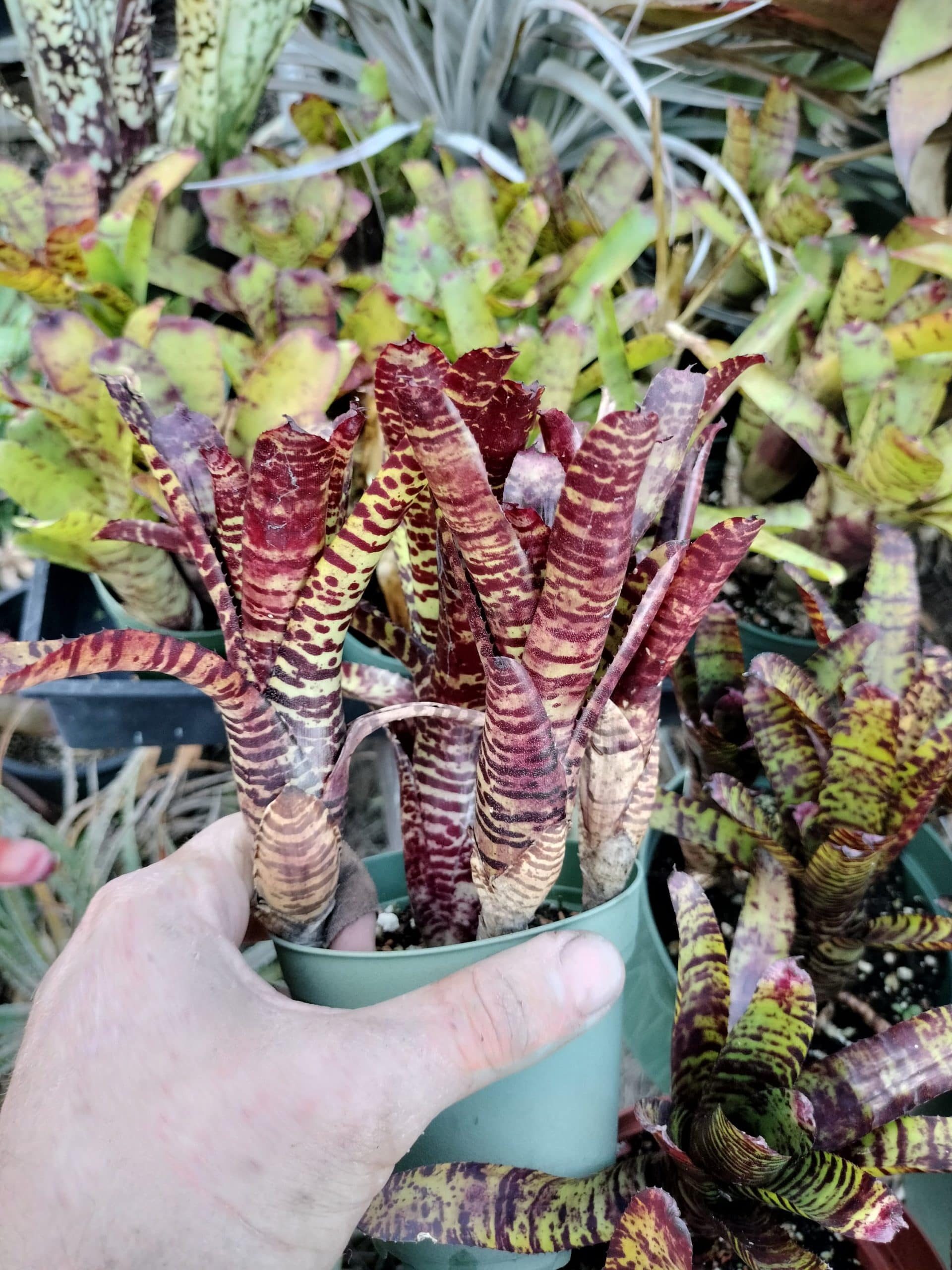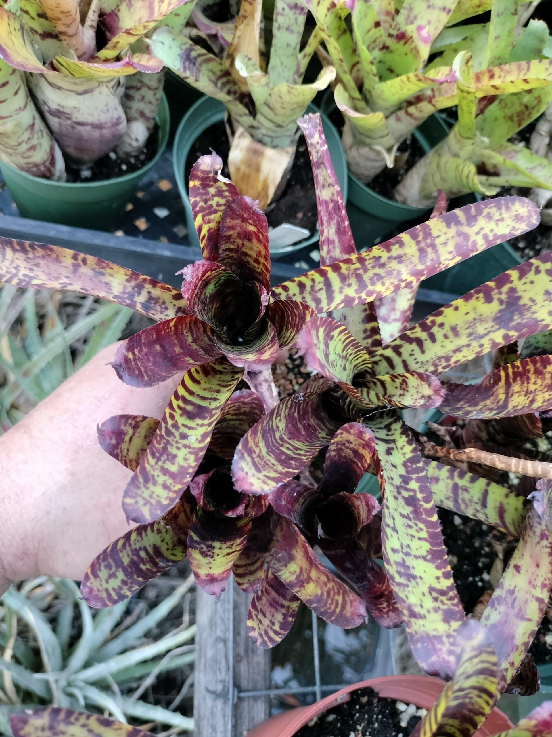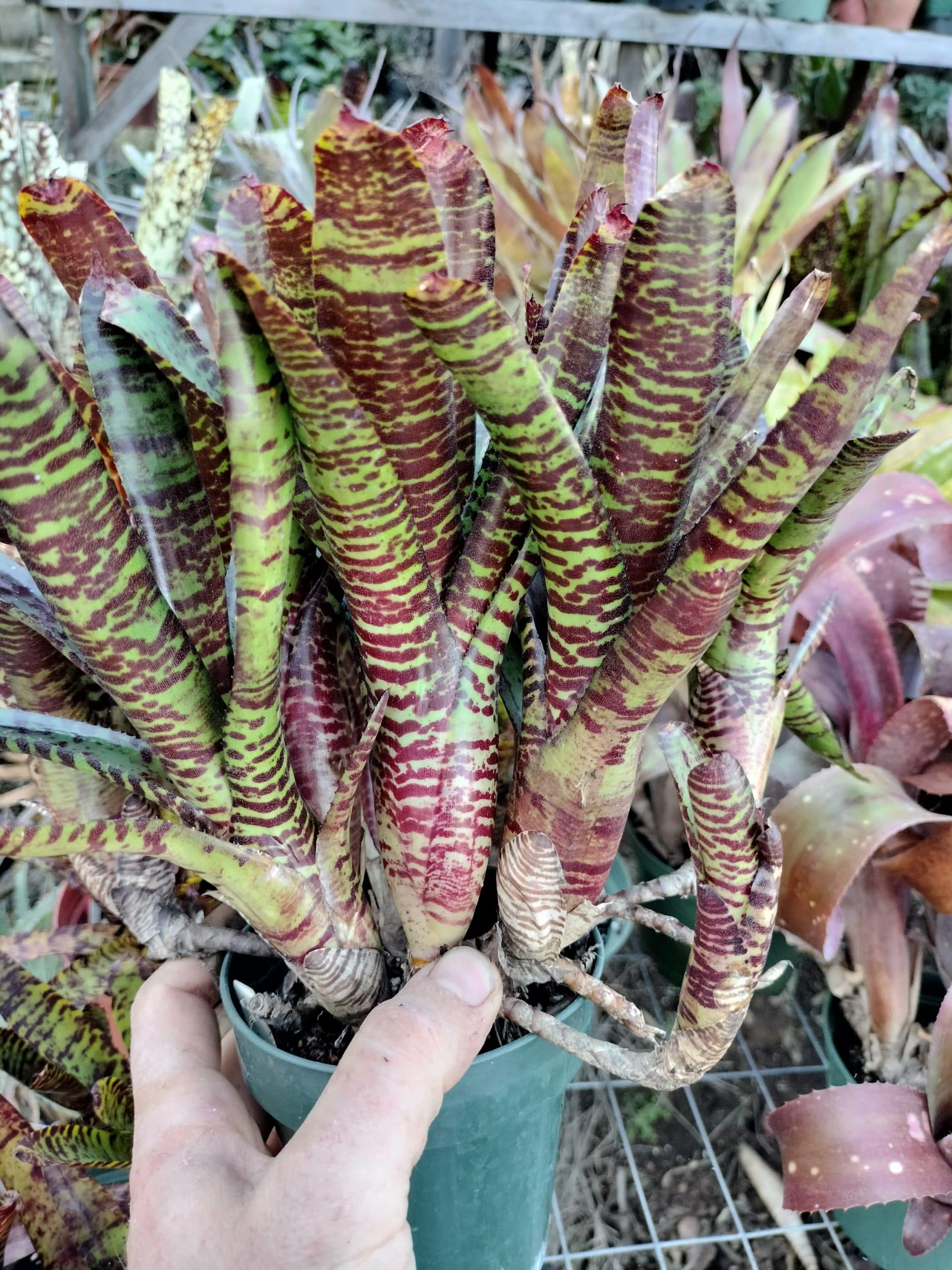 Neoregelia Licorice Twist is a strongly patterned mini.