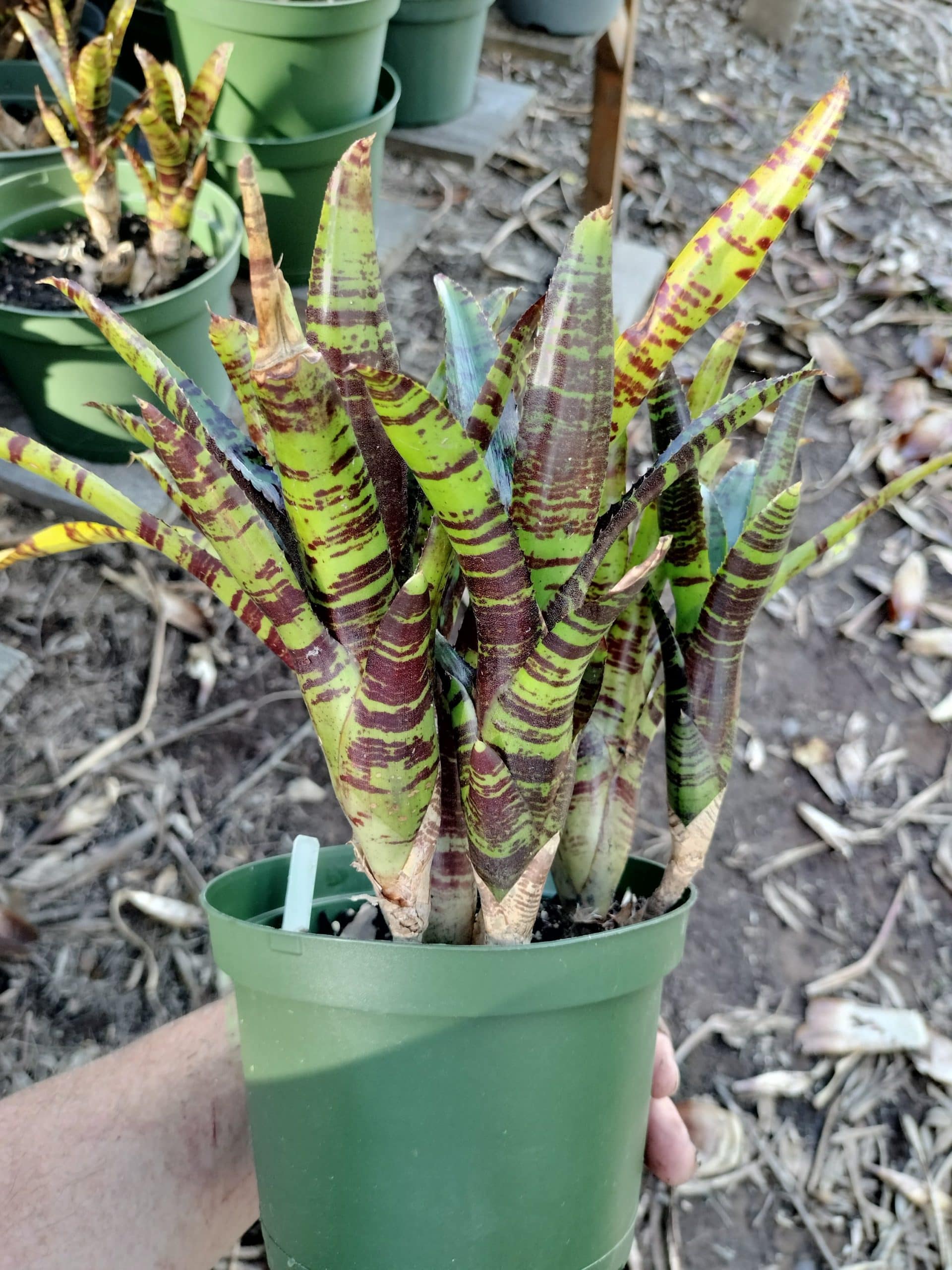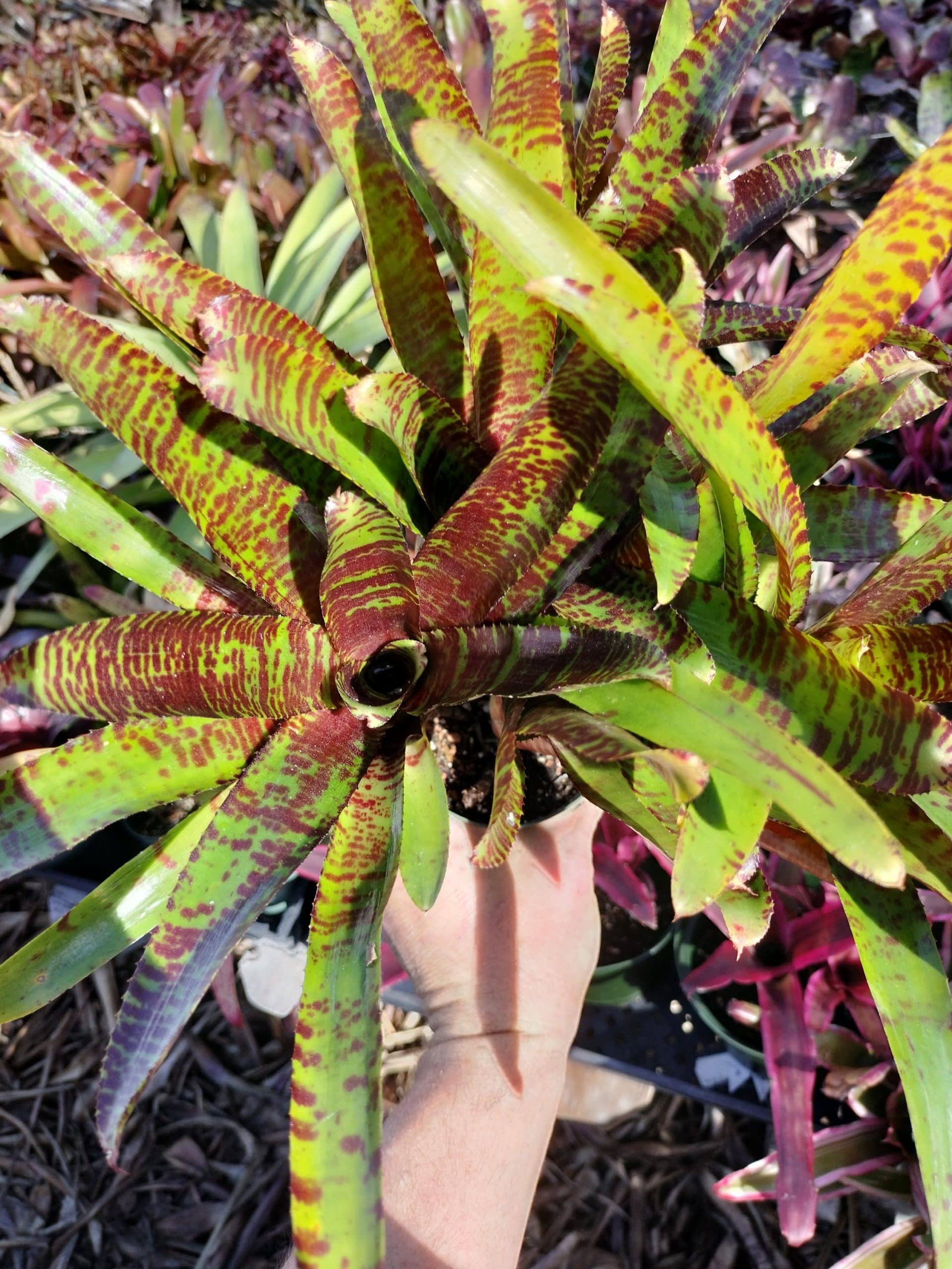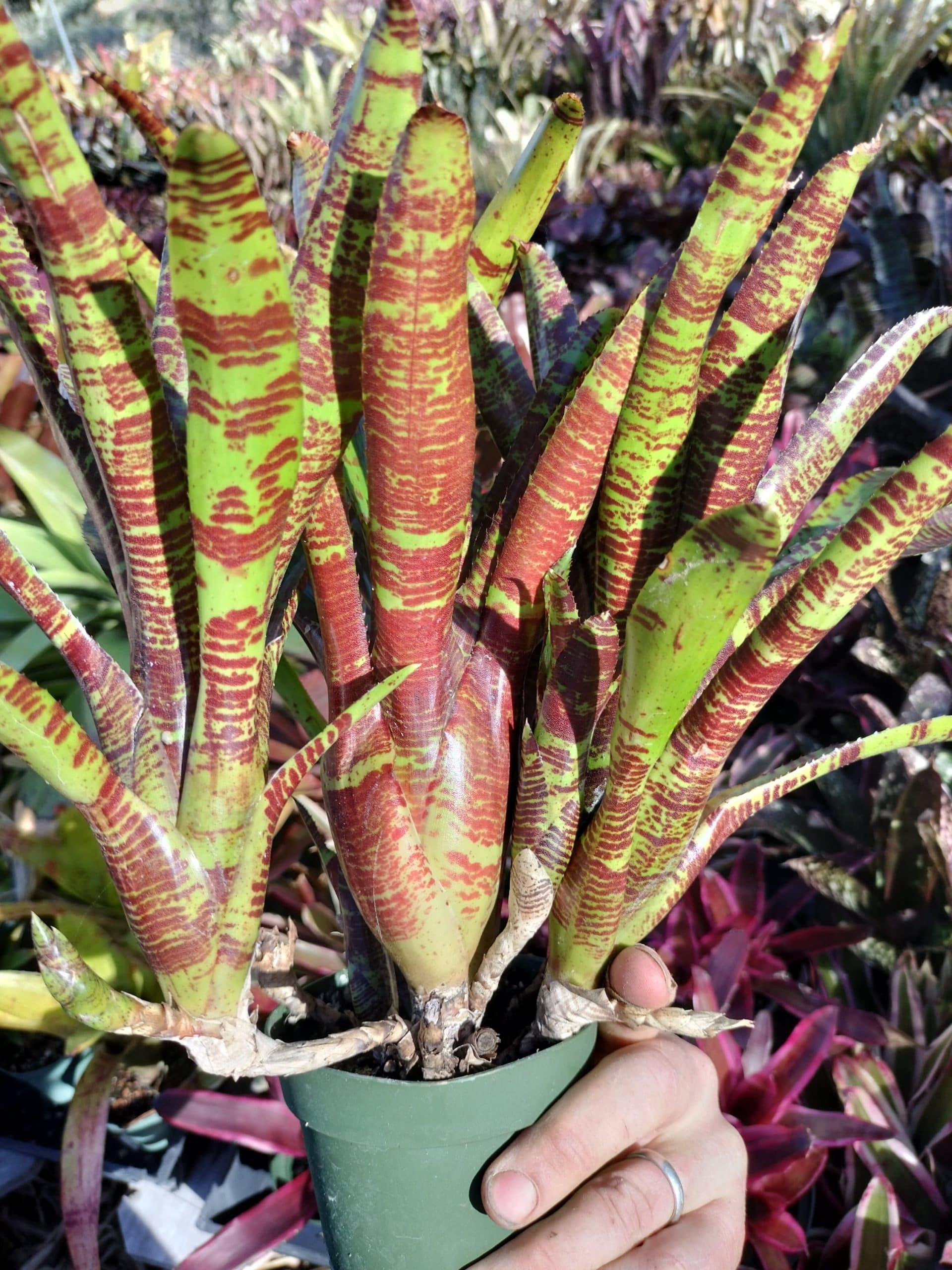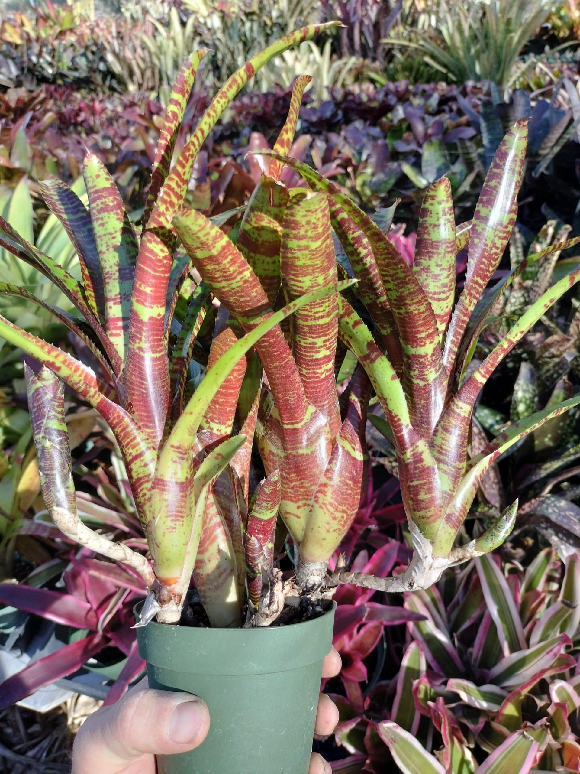 Neoregelia lilliputiana x Blushing Tiger is a mini with bold markings.