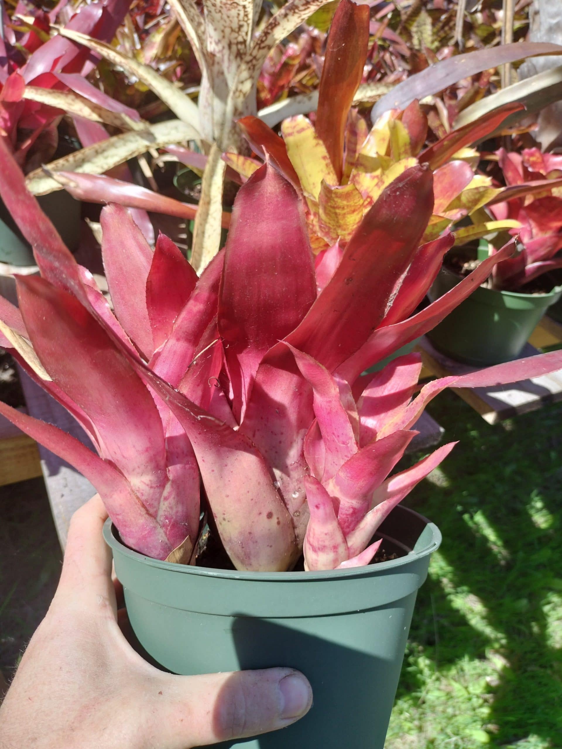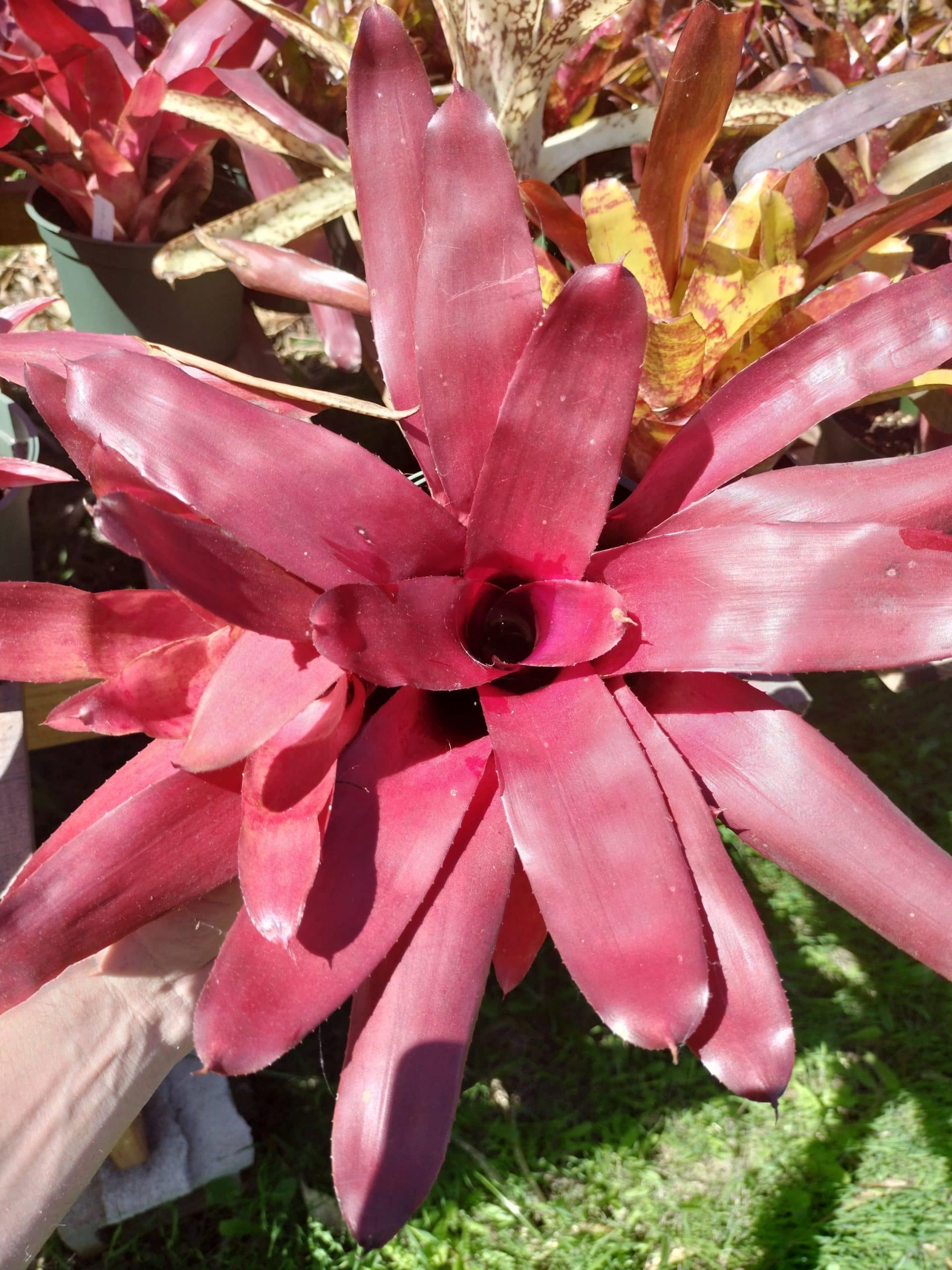 Neoregelia tristis x farinosa is likely an older hybrid with solid color lacking any pattern.