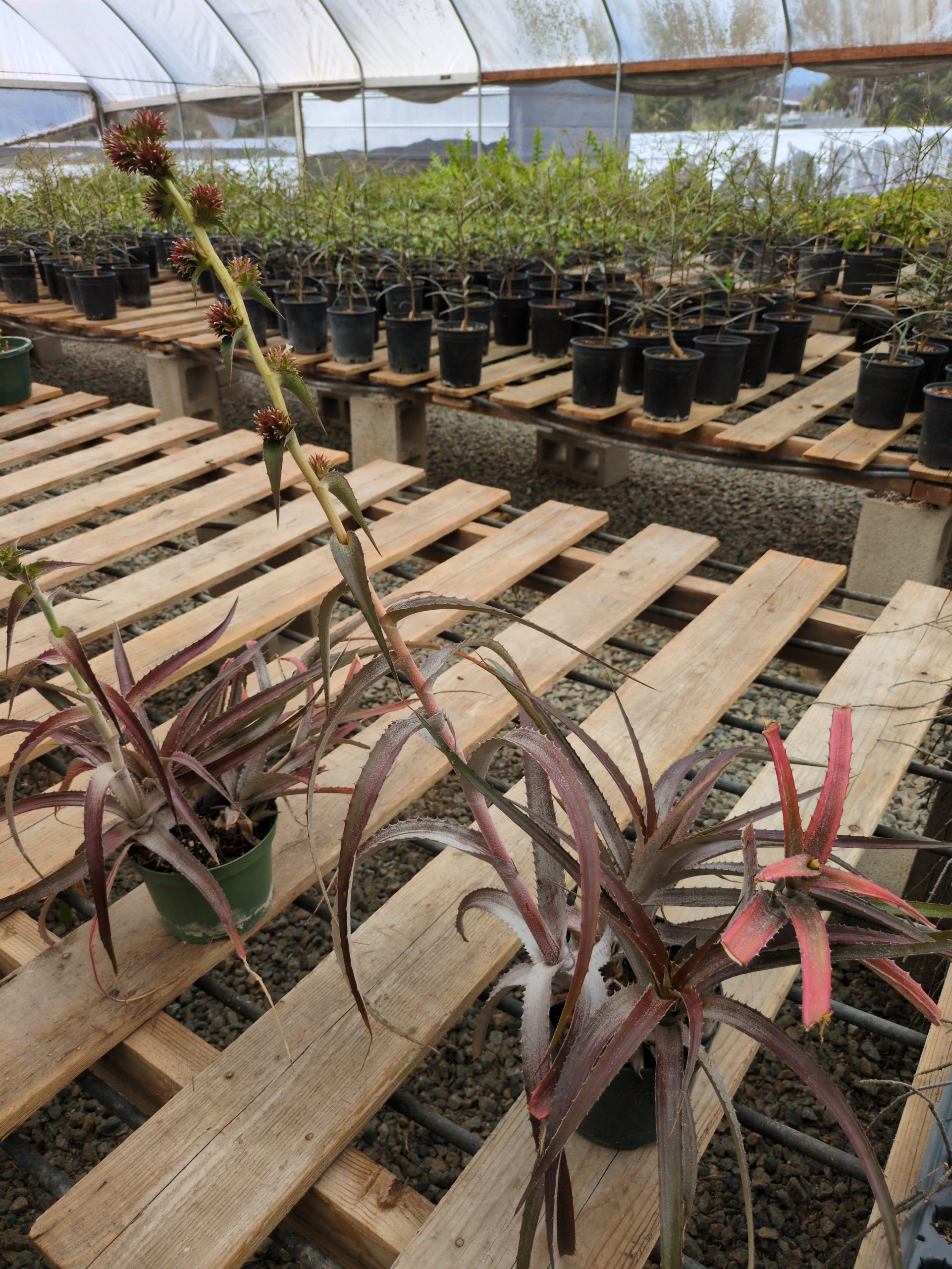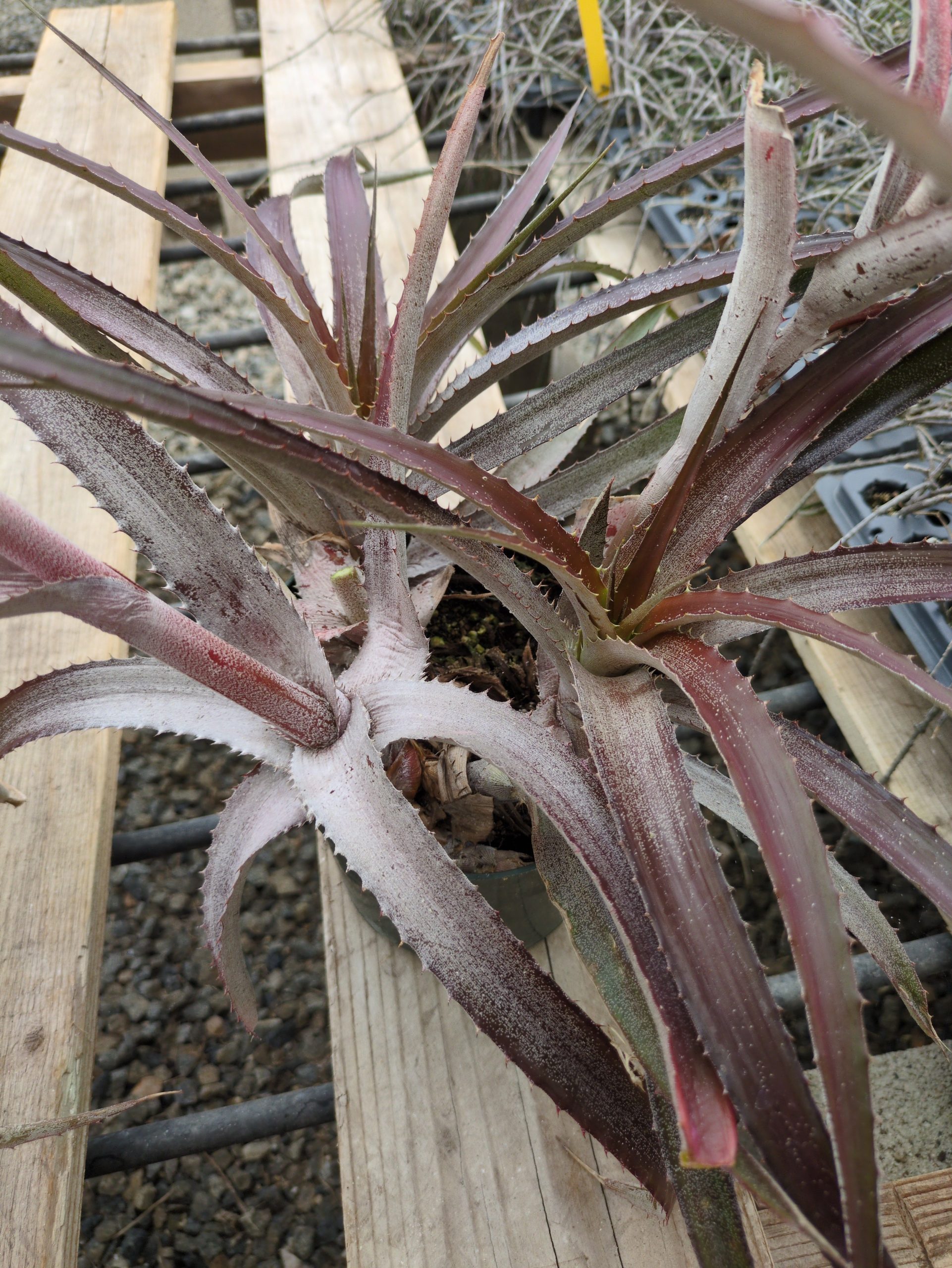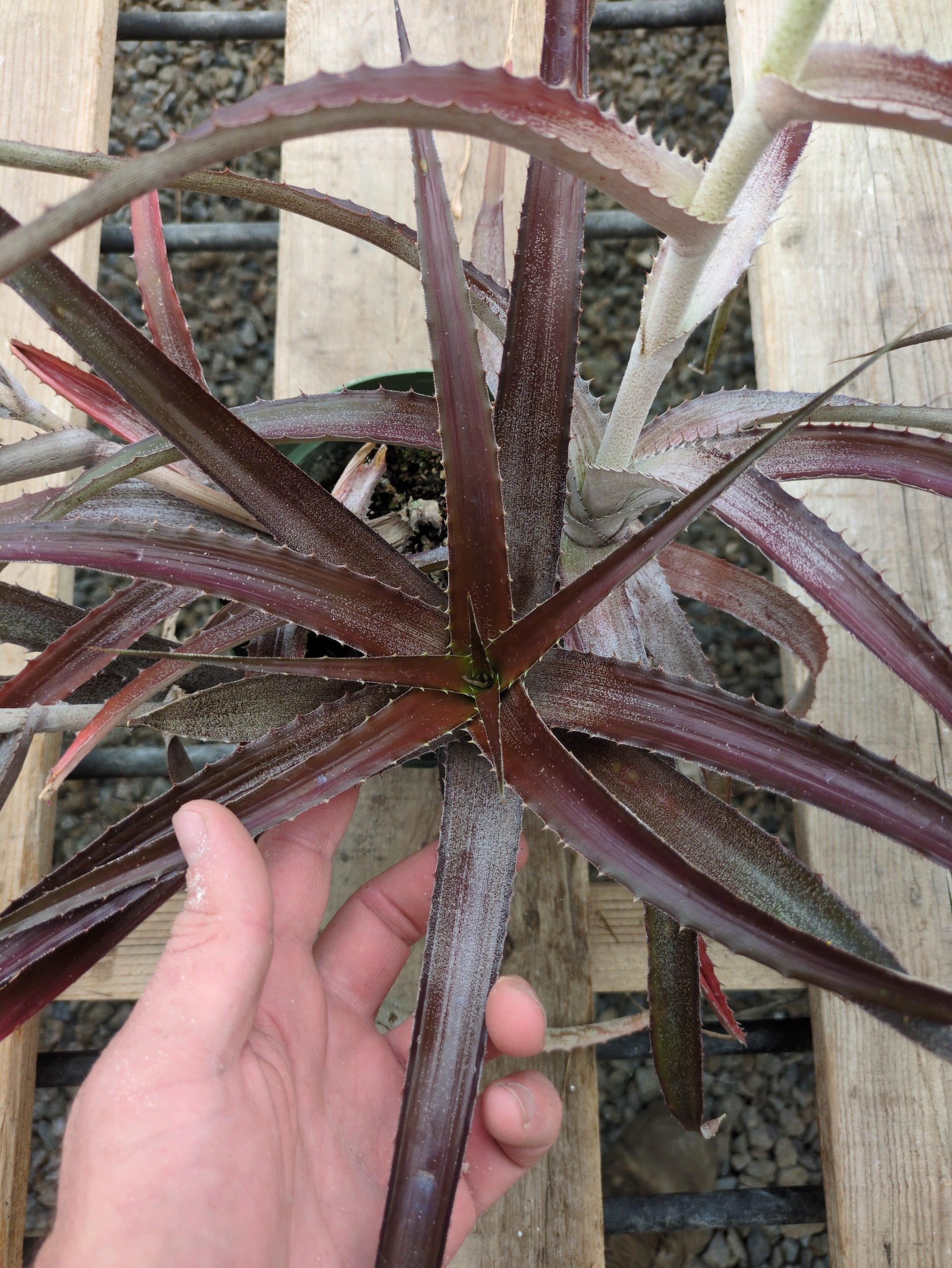 This is a nice species that I haven’t been able to trace back to a published species yet. Leaves are only ~1.5″ wide, recurving downward, with medium stiffness. color is a little wine-red with silvery trichomes that can wear off revealing the strong color. It can bloom up to ~2 feet tall and up to ~18″ wide.