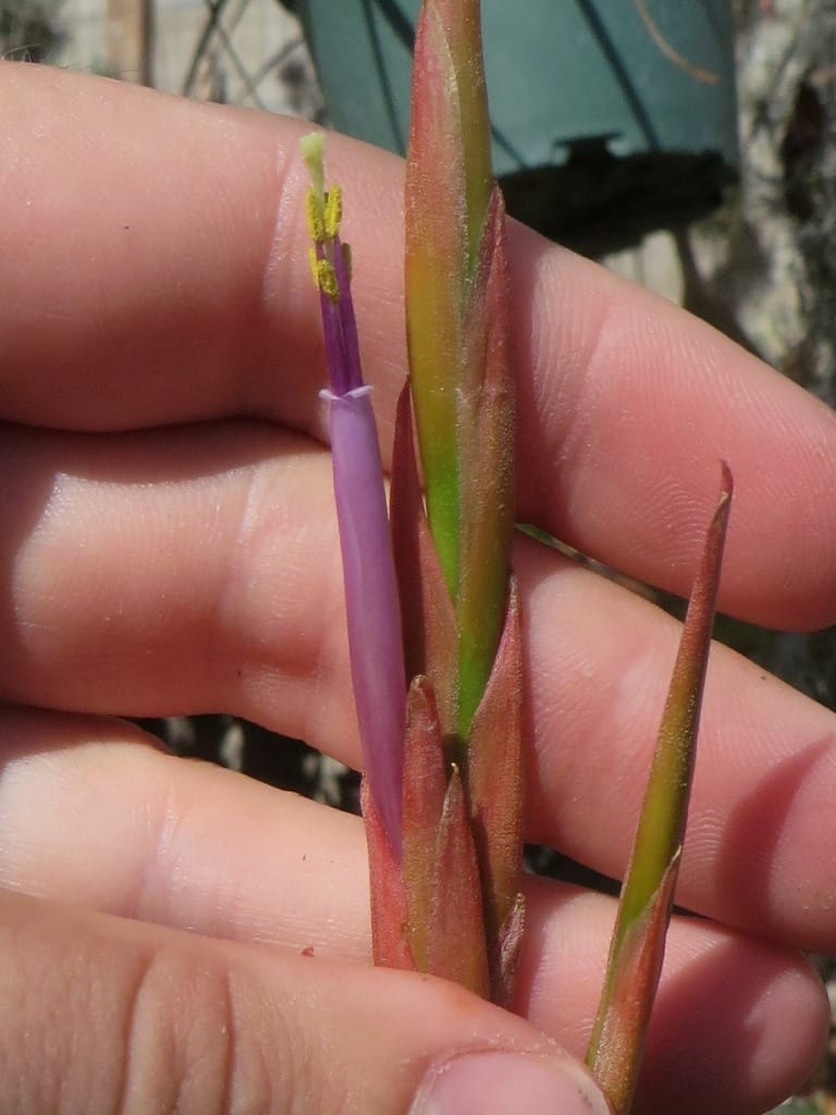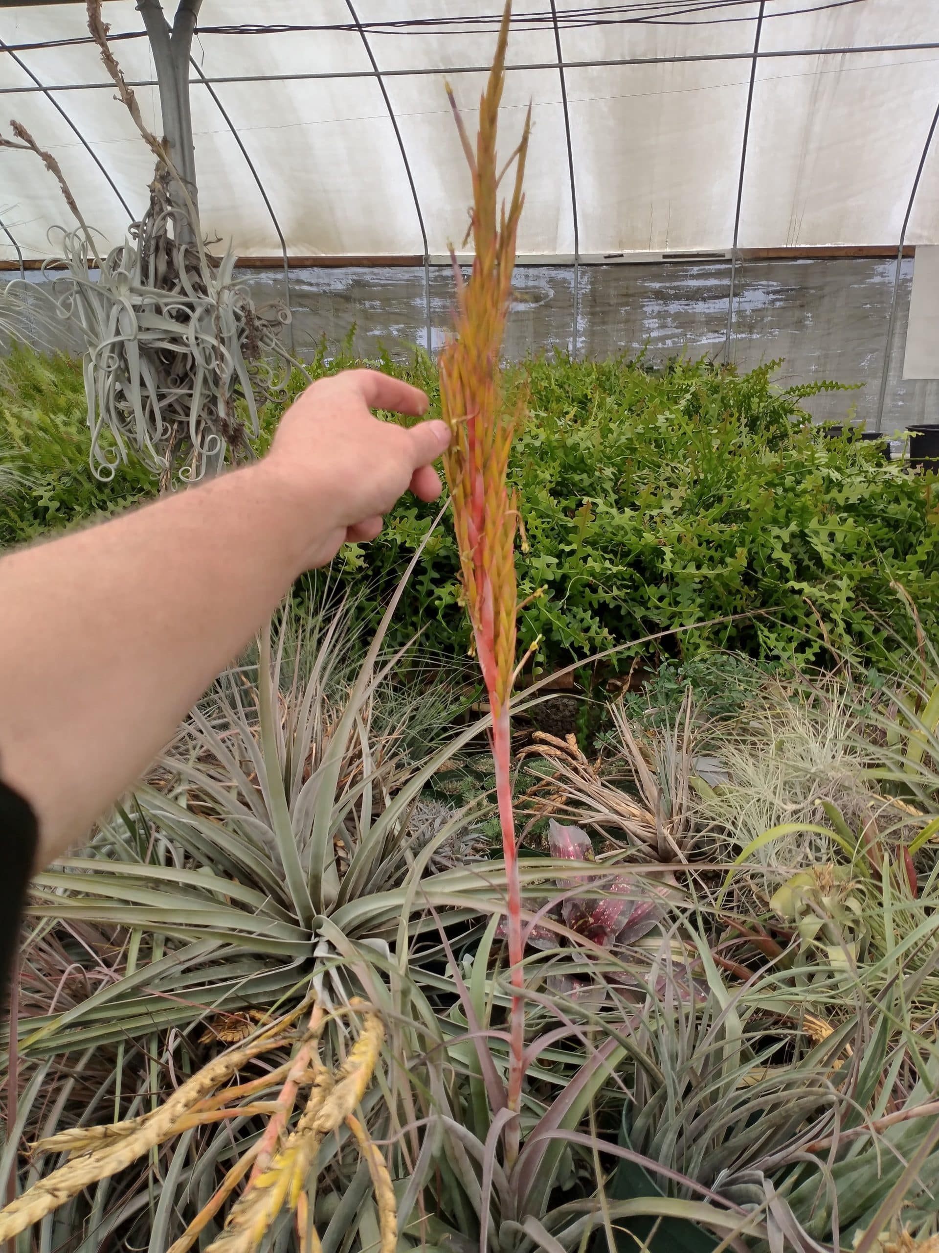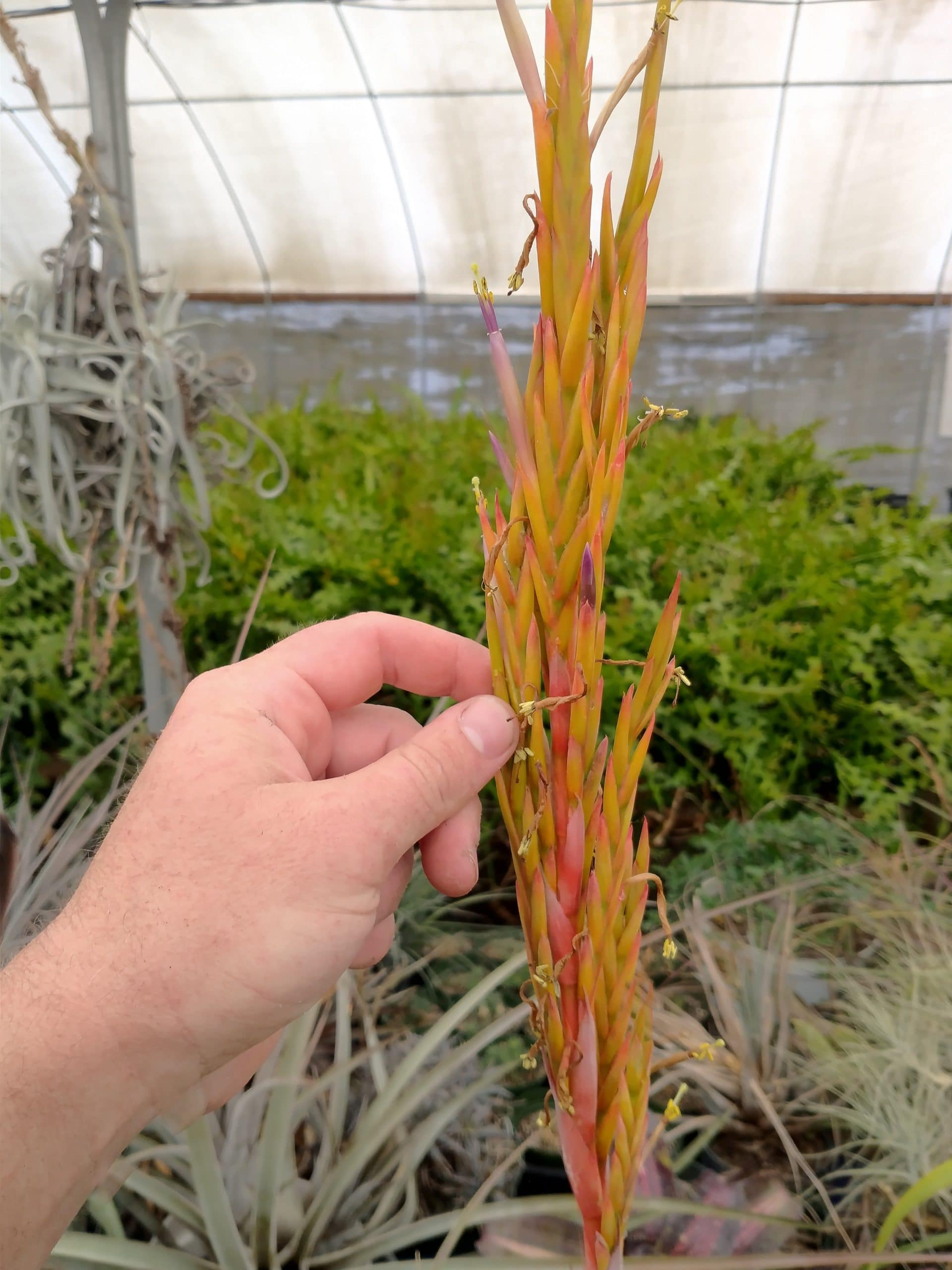 Tillandsia coalcomanensis is a rare species that has a tall, upright rosette of leaves and blooms with an erect inflorescence. Branches are tight against the stems making it almost look like a simple inflorescence.