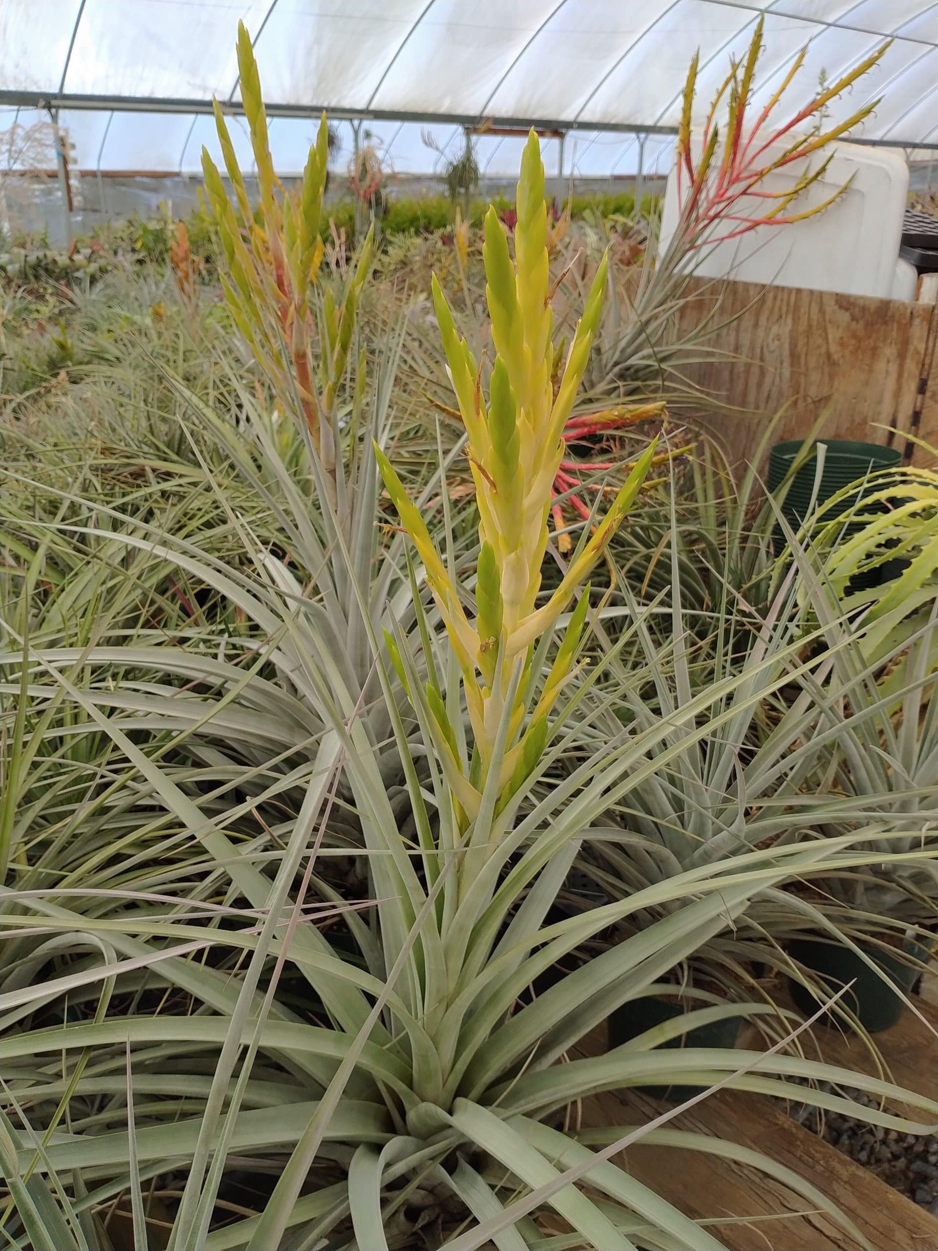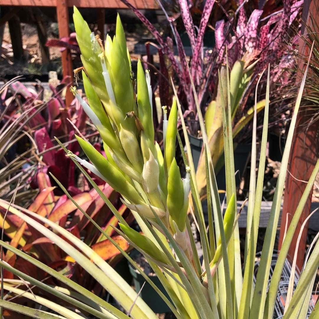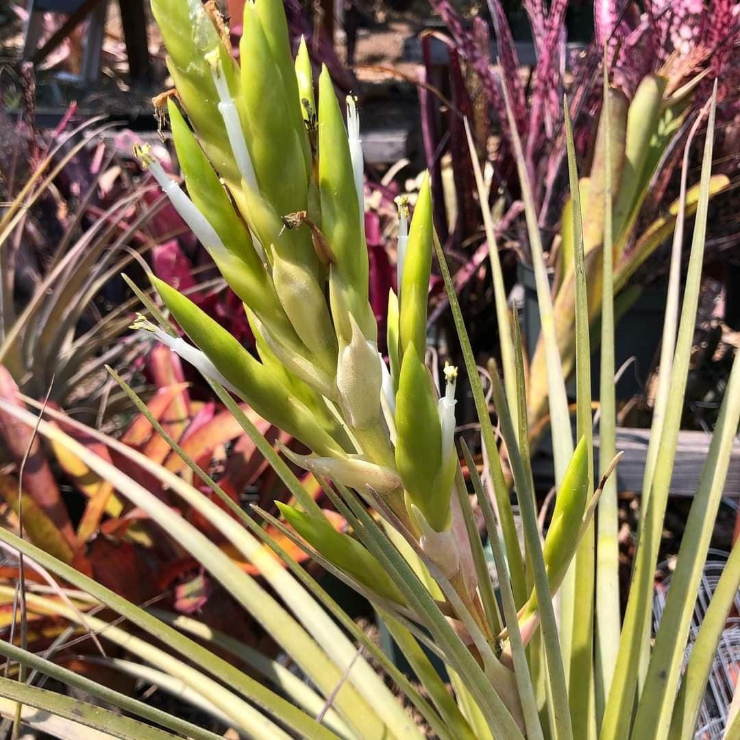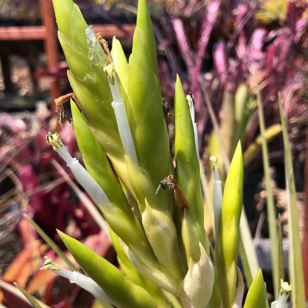 Tillandsia fasciculata var densispica forma alba is a mouthful. It is a albino flowering form of the Florida Tillandsia fasciculata. So instead of bright red bracts and purple petals, this plant has yellow bracts and pure white petals.