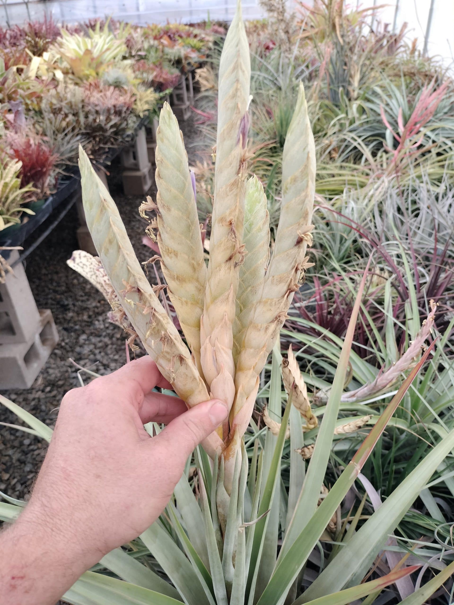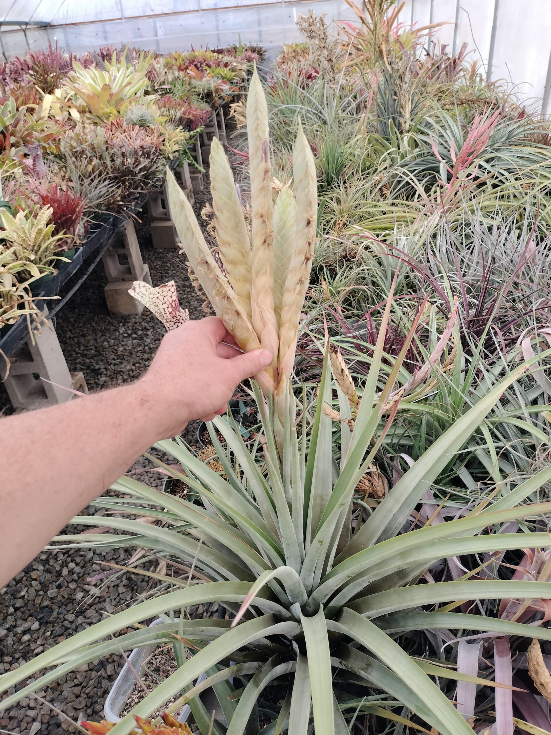 Tillandsia Pinegrove is a large plant that may be even larger than jalisco-monticola. It produces a large, yellowish inflorescence with frosted bracts.