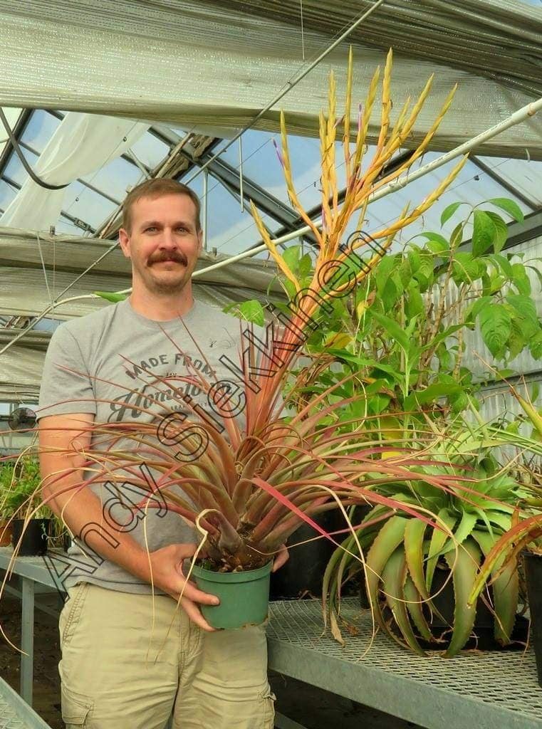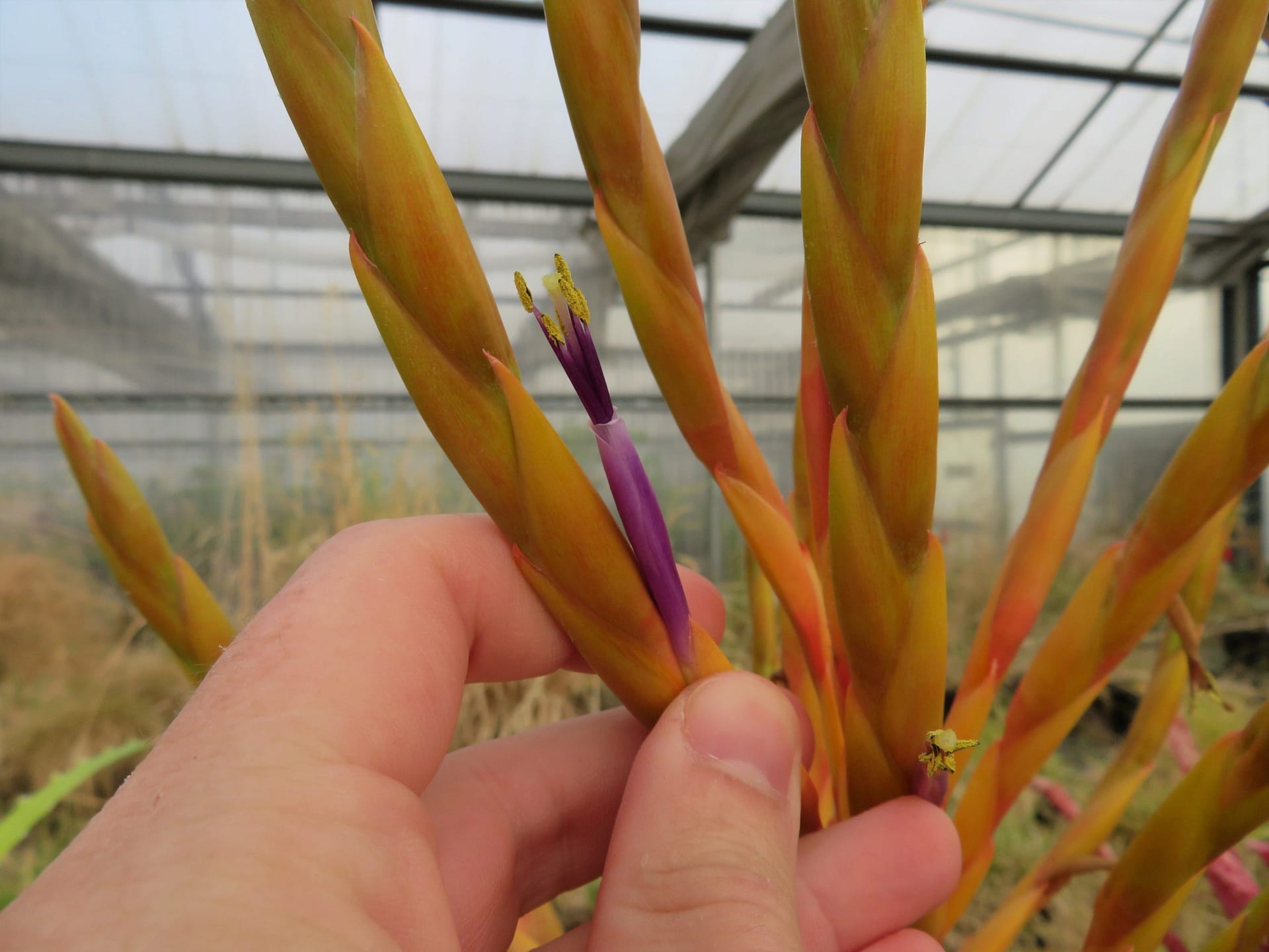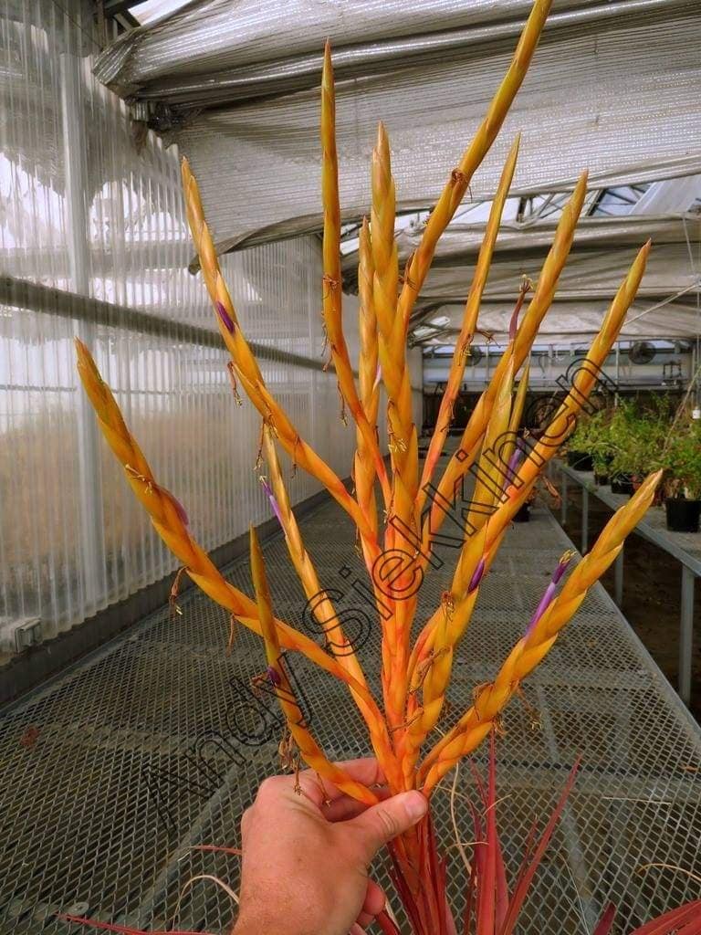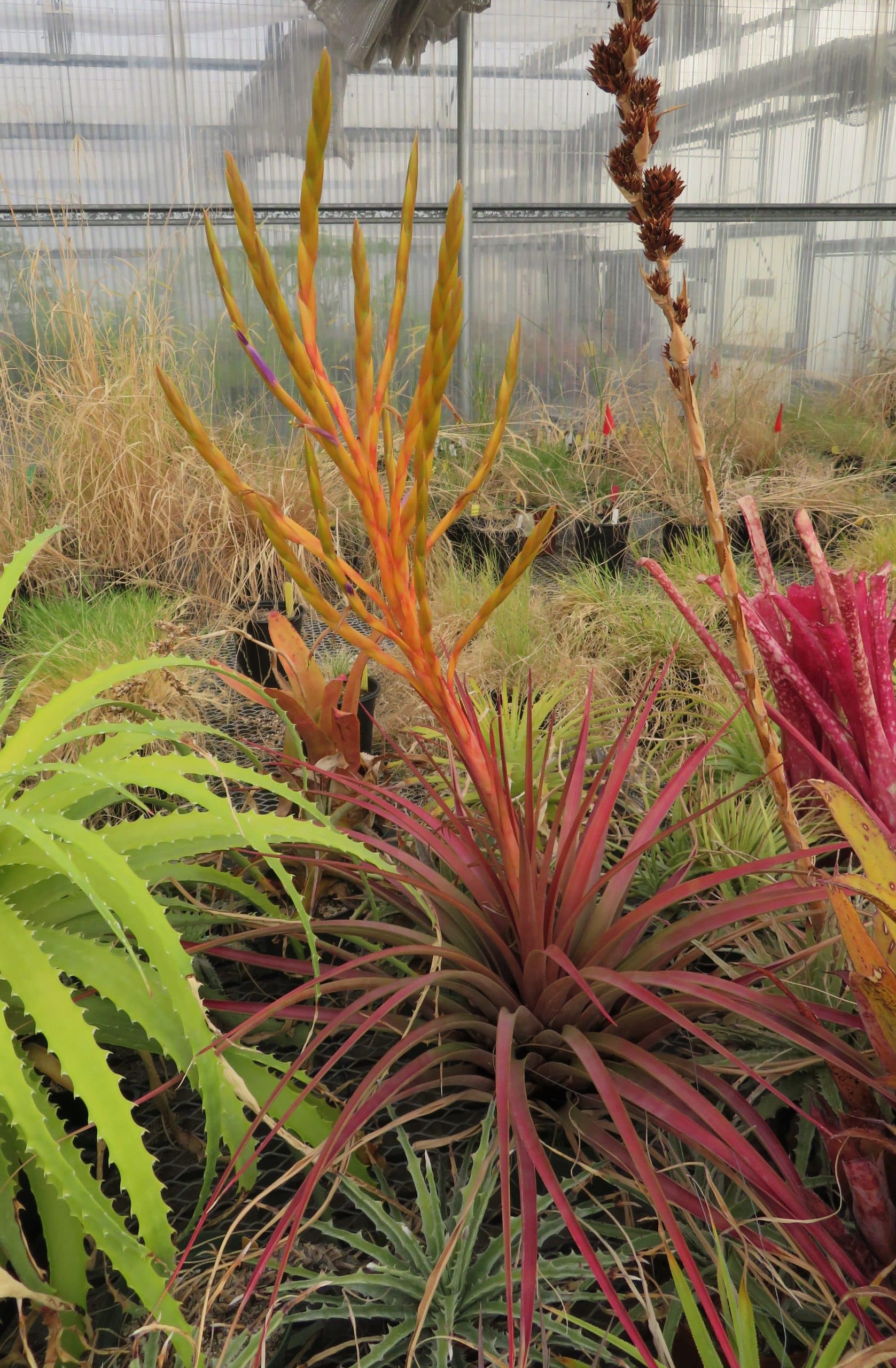 Tillandsia rodrigueziana x makoyana Oaxaca #117-1 is a great natural hybrid with lots of personality. The leaves are reddish like the rodrigueziana parent and the branches of the inflorescence are elongated from the makoyana parent. Available are pups.